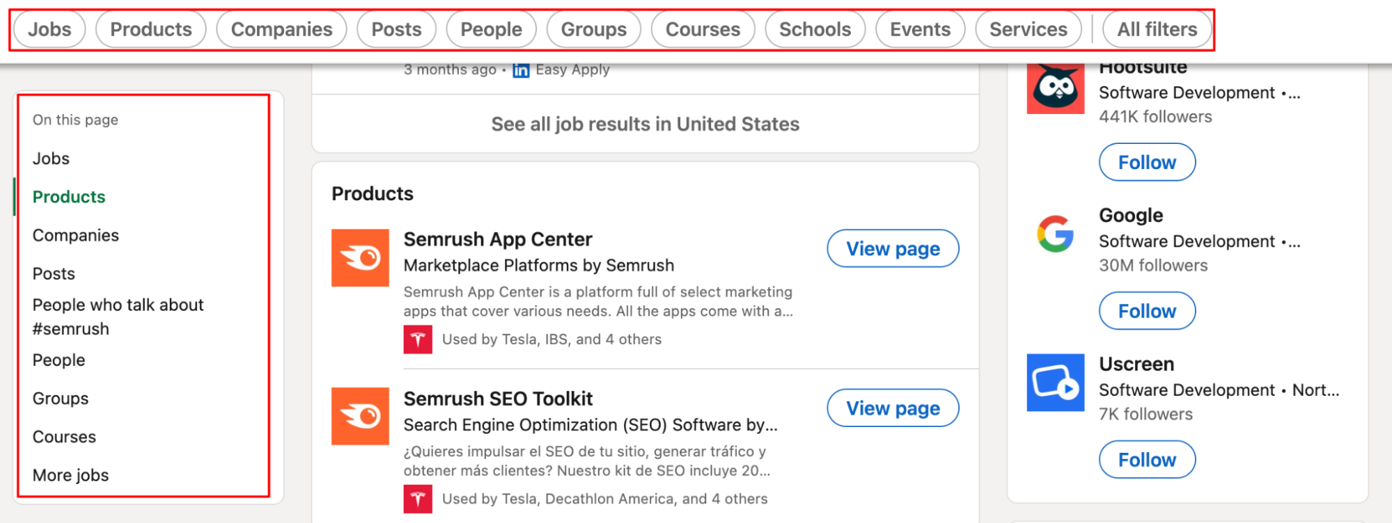 First, you can look for competitor job openings on LinkedIn. Navigate to the “Jobs” tab at the top-middle part of the page. Click “Jobs” and enter your competitor's name into the search bar.